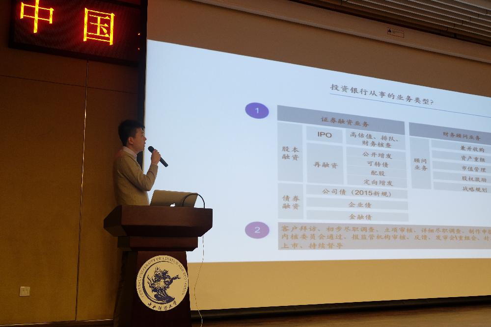 接着,来自不同行业的优秀校友为同学们简要介绍了各金融行业的概况和基本知识,并分享了在该领域工作的宝贵经验。从事证券投行工作的06级研究生赵墉一校友和08级本科生李佳瑞校友介绍了投行从事的业务类型和生活状态,指出对股权投资、上市公司规范管理有兴趣的同学可以考虑从事该行业。从事银行工作的08级本科生吴沛雯校友和09级本科生王珏帅校友介绍了国内外银行业的基本情况、内部机构设置以及面临的机遇与挑战,并与同学们分享了进入银行业需要做哪些准备工作。从事基金工作的07级本科生樊超校友分享了他在证监会以及博恩资产管理公司的工作经历,并简要介绍了各类基金产品的期望风险-收益。他们从不同的角度反映了中金发学子多元的追求、别样的经历和出色的表现,他们慷慨相授的人生经验对同学们对未来的职业选择亦有宝贵的参考价值。